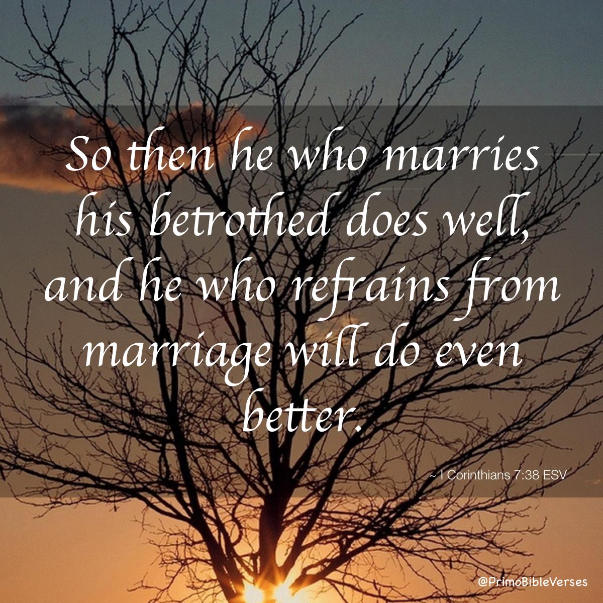 因現今的艱難,我(保羅)的意見是,若是單身,就不要求有妻子,若有妻子,就不要求脫離。娶妻不是犯罪,然而這等人肉身必受苦難。弟兄們,我願你們無所掛慮,沒有娶妻的,是為主的事掛慮,想怎樣叫主喜悅。娶妻的,是為世上的事掛慮,想怎樣叫妻子喜悅。沒有出嫁的,是為主的事掛慮,已出嫁的,是為世上的事掛慮,想怎樣叫丈夫喜悅。我說這話是為你們的益處,不是要牢籠你們,乃是要叫你們行合宜的事。得以殷勤服事主,沒有分心。