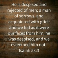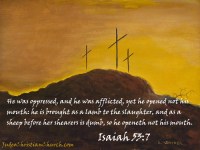 7.他被欺壓,在受苦的時候卻不開口;他像羊羔被牽到宰殺之地,又像羊在剪毛的人手下無聲,他也是這樣不開口。8.因受欺壓和審判,他被奪去,至於他同世的人,誰想他受鞭打、從活人之地被剪除,是因我百姓的罪過呢?9.他雖然未行強暴,口中也沒有詭詐,人還使他與惡人同埋;誰知死的時候與財主同葬。10.耶和華卻定意將他壓傷,使他受痛苦。耶和華以他為贖罪祭。他必看見後裔,並且延長年日。耶和華所喜悅的事必在他手中亨通。11.他必看見自己勞苦的功效,便心滿意足。有許多人因認識我的義僕得稱為義;並且他要擔當他們的罪孽。12.所以,我要使他與位大的同分,與強盛的均分擄物。因為他將命傾倒,以致於死;他也被列在罪犯之中。他卻擔當多人的罪,又為罪犯代求。
