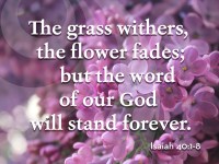 愛我們的主,當祢對我們說,草必枯乾,花必凋殘,惟有祢的話永遠立定時,求祢幫助我們不將信心放在個人的感覺經驗想法上,而是在祢的話語上。特別是當我們以為眼前的成功或失敗,感覺的好與壞彷彿就是永遠,或不想再改變,或以為不會再改變,或認為不會有改變時,主,教導我們,懂得立定在祢永恆的盼望裡面,降服於祢的掌管與拯救,相信眼前的短暫有祢要做成的工,就是要引領我們領受應許的永恆。主,憐憫我們。