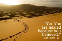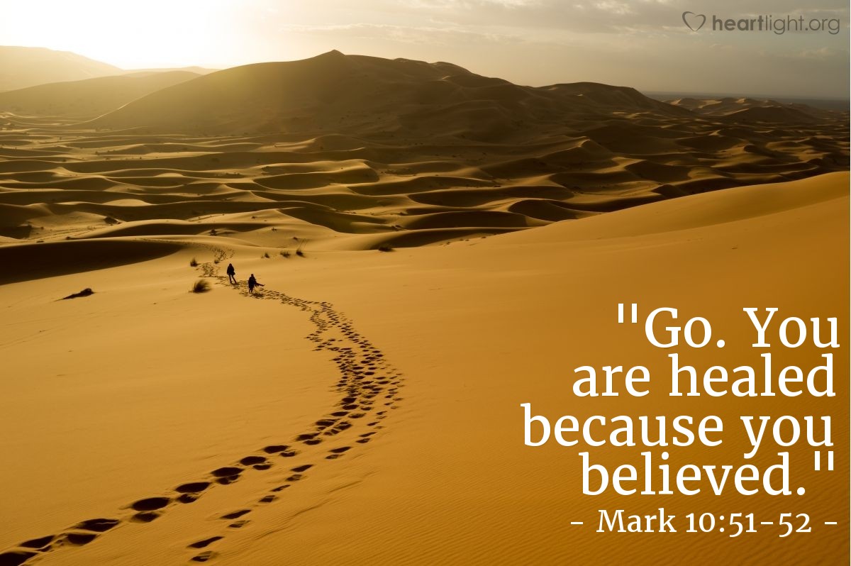 眼瞎又在路邊討飯的巴底買,就人看來,有足夠的理由哀怨悲嘆,或許,耶穌是他人生奮力一搏,最後的希望吧!當巴底買聽見耶穌就在附近,死命的發出聲音,連旁人對他的責備,也阻擋不了巴底買向耶穌呼求憐憫.耶穌聽見巴底買的聲音,但耶穌沒有走到巴底買那裏,而是讓巴底買來到耶穌的面前.表明自己想要看見的渴望.巴底買被醫治得看見,就在路上.那原本是討飯求生的地方,成了跟隨耶穌的現場.