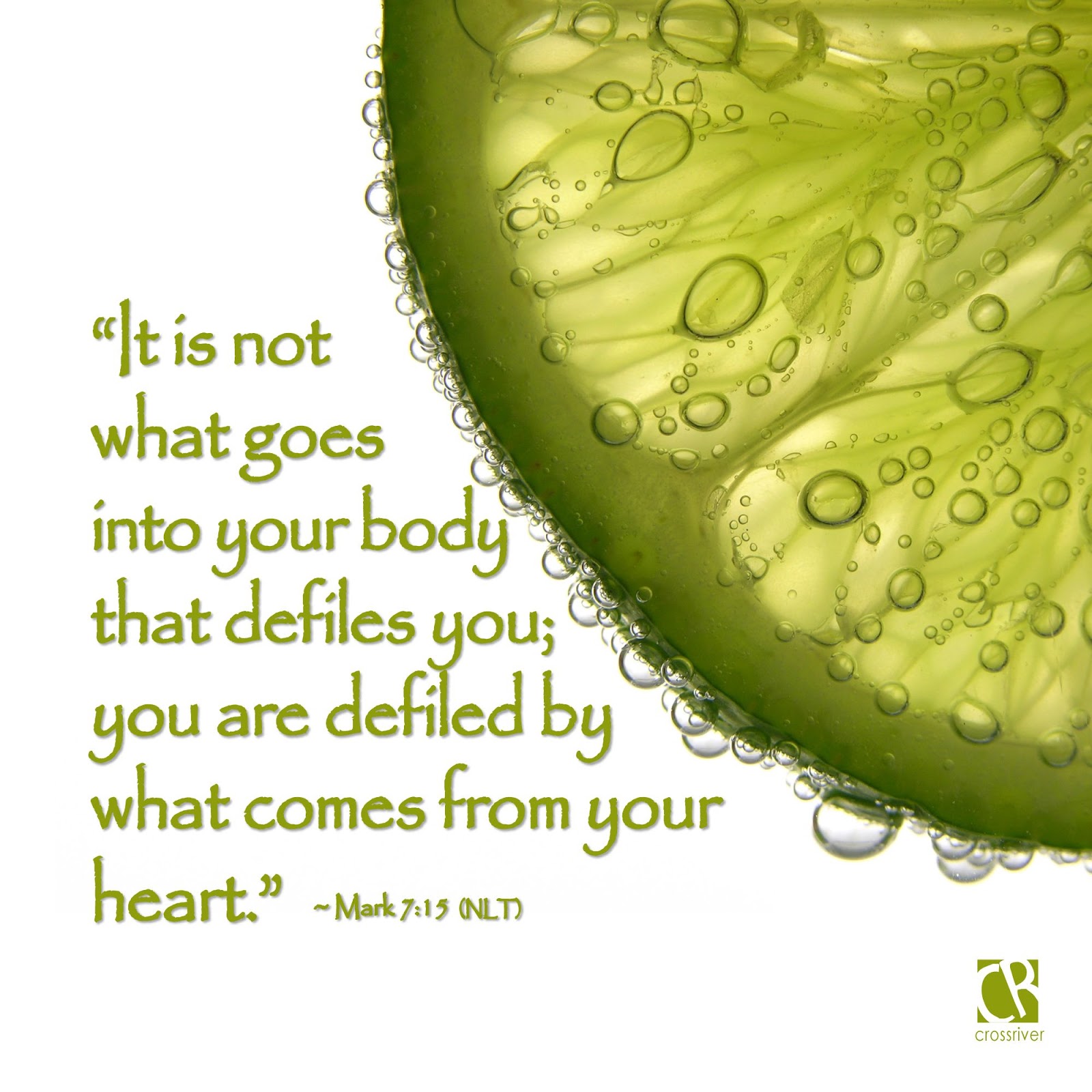 耶穌對眾人說:外面進去的不能污穢人,從裏面出來的仍能污穢人.有耳可聽的,就應當聽.稍後,門徒問耶穌這比喻的意思.耶穌說:從外面進入的,不是入他的心,乃是入他的肚腹,又落到茅廁裏.(這是說,各樣的食物都是潔淨的).又說:從人裏面出來的,就是從心裏發出的惡念,貪婪,詭詐,忌妒,驕傲,這一切的惡都是從裏面出來,且能污穢人.