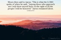 亞倫其中的兩個兒子,各拿自己的香爐,在神面前獻上神沒有吩咐他們的凡火,他們就死在神的面前。摩西對亞倫說,這就是神所說,我在親近我的人中要顯為聖,在眾民面前我要得榮耀。神曉諭亞倫,你和你兒子進會幕時清濃酒都不可喝,免得你們死亡。使你們可以將聖的俗的,潔淨的不潔淨的分別出來,又使你們可以將神一切的律例教導以色列百姓。
