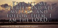 你們要遵守神的律例。牲畜不可異類相配,種子不可兩樣摻雜,人若有了過失,祭司要用贖愆祭的羊,在神面前贖他所犯的罪,使罪蒙赦免。你們到了迦南地,第四年所結的果子,全要成為聖,用以讚美神,第五年你們要吃那樹上的果子。我是耶和華你們的神。你們要守安息日為聖,不可用法術、觀兆偏向那些交鬼和行巫術的,要尊敬老人,不可欺負寄居的,施行審判要用公道的天平法碼,你們要謹守遵行我一切的律例典章,我是耶和華。