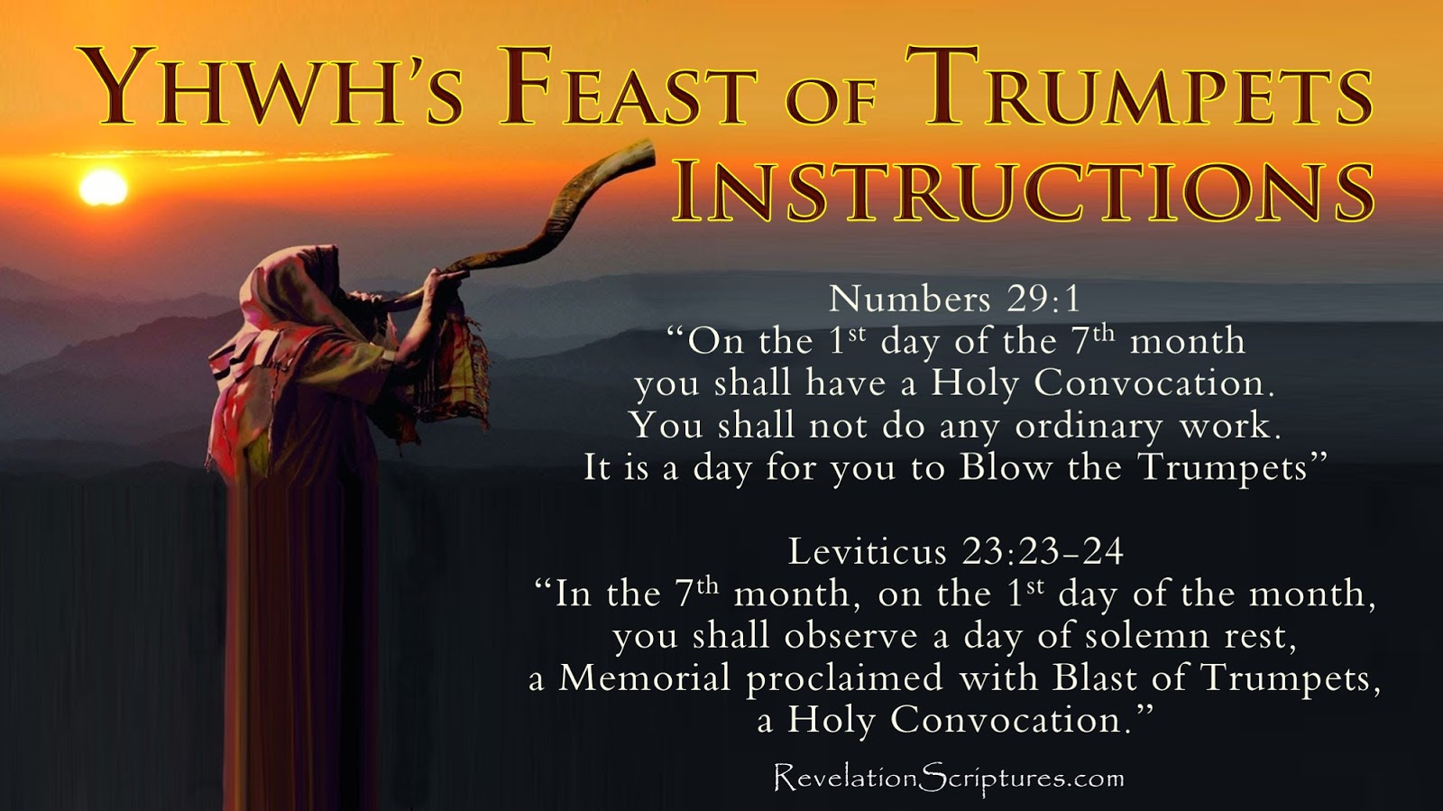 23.耶和華對摩西說:24.「你曉諭以色列人說:七月初一,你們要守為聖安息日,要吹角作紀念,當有聖會。25.甚麼勞碌的工都不可做;要將火祭獻給耶和華。」26.耶和華曉諭摩西說:27.「七月初十是贖罪日;你們要守為聖會,並要刻苦己心,也要將火祭獻給耶和華。28.當這日,甚麼工都不可做;因為是贖罪日,要在耶和華─你們的 神面前贖罪。29.當這日,凡不刻苦己心的,必從民中剪除。30.凡這日做甚麼工的,我必將他從民中除滅。31.你們甚麼工都不可做。這在你們一切的住處作為世世代代永遠的定例。32.你們要守這日為聖安息日,並要刻苦己心。從這月初九日晚上到次日晚上,要守為安息日。」