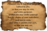 14.「你要寫信給老底嘉教會的使者,說:『那為阿們的,為誠信真實見證的,在神創造萬物之上為元首的,說:15.我知道你的行為,你也不冷也不熱;我巴不得你或冷或熱。16.你既如溫水,也不冷也不熱,所以我必從我口中把你吐出去。17.你說:我是富足,已經發了財,一樣都不缺;卻不知道你是那困苦、可憐、貧窮、瞎眼、赤身的。18.我勸你向我買火煉的金子,叫你富足;又買白衣穿上,叫你赤身的羞恥不露出來;又買眼藥擦你的眼睛,使你能看見。19.凡我所疼愛的,我就責備管教他;所以你要發熱心,也要悔改。20.看哪,我站在門外叩門,若有聽見我聲音就開門的,我要進到他那裡去,我與他,他與我一同坐席。21.得勝的,我要賜他在我寶座上與我同坐,就如我得了勝,在我父的寶座上與他同坐一般。22.聖靈向眾教會所說的話,凡有耳的,就應當聽!』」