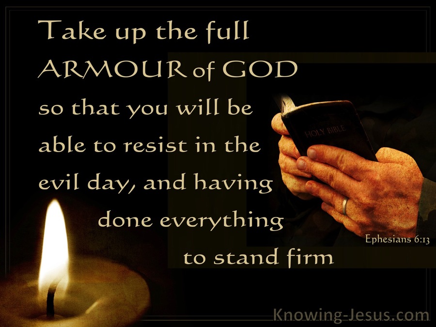 10.我還有末了的話:你們要靠著主,倚賴他的大能大力作剛強的人。11.要穿戴神所賜的全副軍裝,就能抵擋魔鬼的詭計。12.因我們並不是與屬血氣的爭戰,乃是與那些執政的、掌權的、管轄這幽暗世界的,以及天空屬靈氣的惡魔爭戰。13.所以,要拿起神所賜的全副軍裝,好在磨難的日子抵擋仇敵,並且成就了一切,還能站立得住。14.所以要站穩了,用真理當作帶子束腰,用公義當作護心鏡遮胸,15.又用平安的福音當作預備走路的鞋穿在腳上。16.此外,又拿著信德當作盾牌,可以滅盡那惡者一切的火箭;17.並戴上救恩的頭盔,拿著聖靈的寶劍,就是神的道。