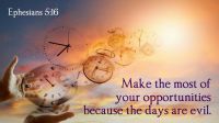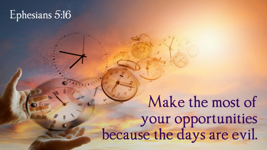 保羅勸勉教會要把握時間行走在神的旨意當中。消極方面是不愚昧、不糊塗、不醉酒。積極方面行事為人要有智慧、滿有聖靈、充滿感謝、心存敬畏、順服基督。因為時間不會停留,但不是人人都能意識到時間的寶貴,總以為還有明天,而輕忽稍縱即逝的現在,那能夠尋求與神親近的機會。