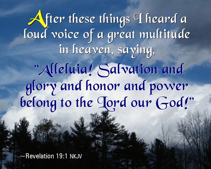 有一個時候是天上地下同有讚美歸榮耀歸神的時刻。因為有神全然公義的彰顯,有神申冤行動的出現。腐朽墮落敗壞在神的榮光之中不再有任何權勢與作用。天地之間充滿的就是對神的歡呼讚美稱頌。如同娶妻的宴席,羔羊的婚宴,也為所有認識敬畏祂的名,歷經憂患痛苦至死仍持守所信之人所預備的相聚。這相聚唯一的理由只因為他們付上了一生的代價,始終相信耶穌是他們的救主和生命的主而有的豐盛果子。