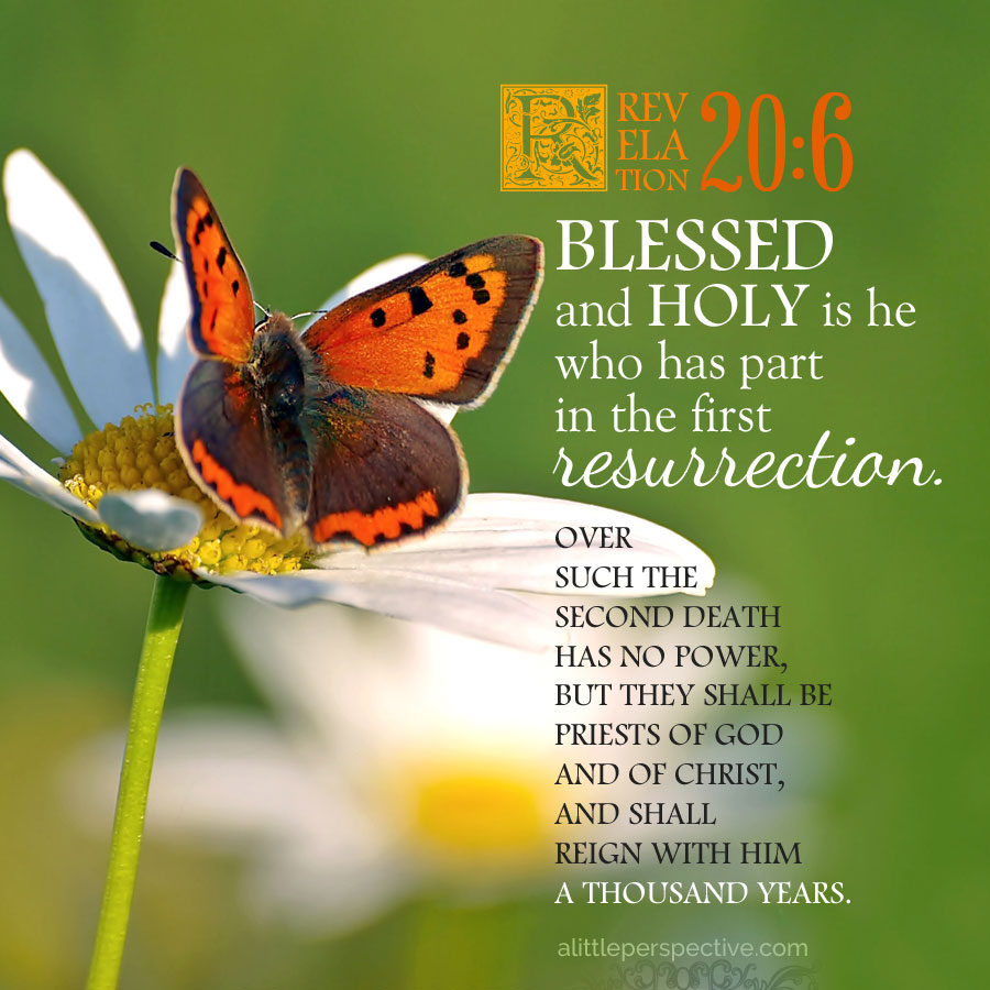 1.我又看見一位天使從天降下,手裡拿著無底坑的鑰匙和一條大鍊子。2.他捉住那龍,就是古蛇,又叫魔鬼,也叫撒但,把牠捆綁一千年,3. 扔在無底坑裡,將無底坑關閉,用印封上,使牠不得再迷惑列國。等到那一千年完了,以後必須暫時釋放牠。4.我又看見幾個寶座,也有坐在上面的,並有審判的權柄賜給他們。我又看見那些因為給耶穌作見證,並為神之道被斬者的靈魂,和那沒有拜過獸與獸像,也沒有在額上和手上受過他印記之人的靈魂,他們都復活了,與基督一同作王一千年。5.這是頭一次的復活。6.在頭一次復活有分的有福了,聖潔了!第二次的死在他們身上沒有權柄。他們必作神和基督的祭司,並要與基督一同作王一千年。