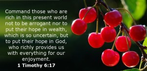 17.你要囑咐那些今世富足的人,不要自高,也不要倚靠無定的錢財;只要倚靠那厚賜百物給我們享受的神。18.又要囑咐他們行善,在好事上富足,甘心施捨,樂意供給人,19.為自己積成美好的根基,預備將來,叫他們持定那真正的生命。20.提摩太啊,你要保守所託付你的,躲避世俗的虛談和那敵真道、似是而非的學問。21.已經有人自稱有這學問,就偏離了真道。願恩惠常與你們同在!
