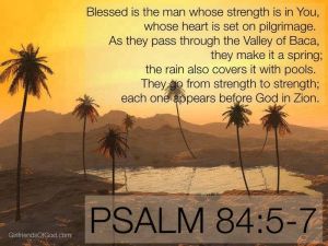 8.流淚谷形容朝聖者在路途中的艱辛,但時候到了,所流的眼淚將成為泉源之地。有秋雨之福蓋滿全谷。你們若留意聽從我今日所吩咐的誡命,愛耶和華─你們的神,盡心盡性事奉他,他必按時降秋雨春雨在你們的地上,使你們可以收藏五穀、新酒,和油,也必使你吃得飽足,並使田野為你的牲畜長草(申命記11:13-15)。看哪,農夫忍耐等候地裡寶貴的出產,直到得了秋雨春雨。(雅各書5:7b)