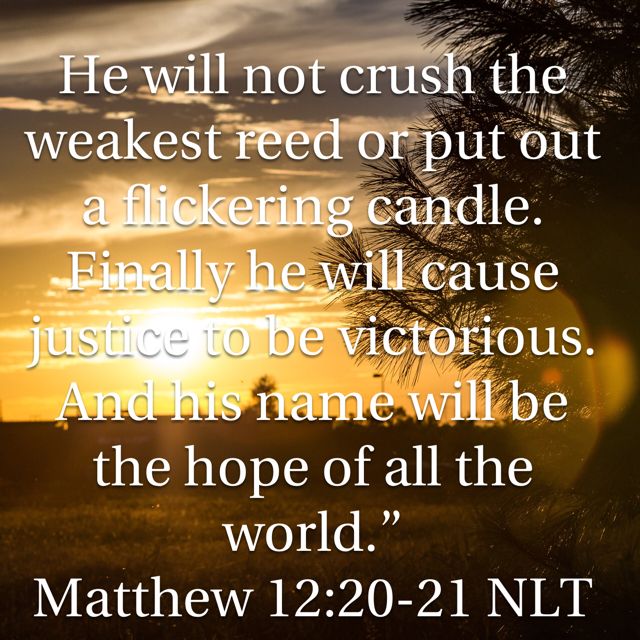 律法本身無法生出憐憫,唯有頒佈律法的主,能夠藉著成全律法把憐憫賜給我們。我們無法仍在罪中期待有憐憫,但令人無法理解的是,只配得受審的我們,主卻定意用祂自己的生命,替我們受審,滿足律法的要求,把我們贖回,成為兒女,作新造人。耶穌所說,那壓傷的蘆葦,會是誰呢?那將殘的燈火,又是誰呢?今天,主仍在尋找並邀請那被壓傷的心,如將殘的靈,來領受祂已為你成全的愛,智慧和憐憫。而我們所須要的,就是讓主的話語存留在心裡,並且容讓主的作為施行在當中。渴望主繼續在我生命中的拆毀與建造,以柔軟的心代替硬心。仰望主持續在我生活中的禁止與引導。以活水泉源代替枯井。
