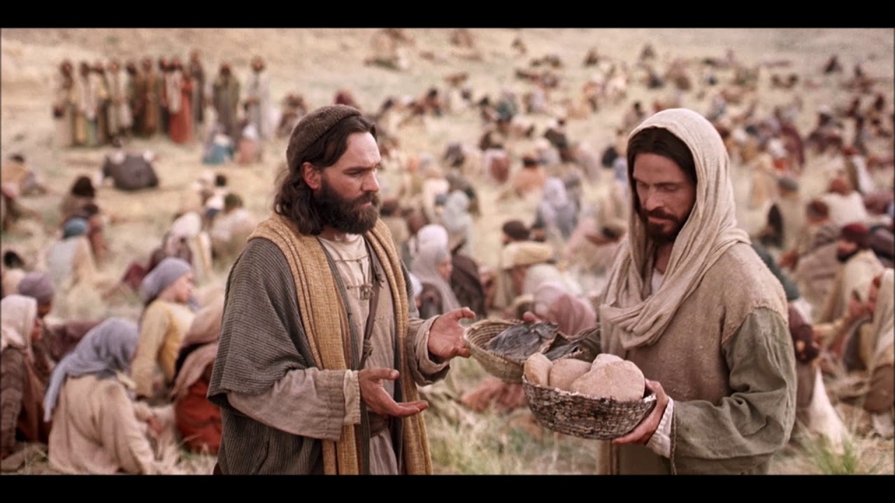 耶穌聽見施洗約翰遇害,就獨自退到野地。眾人聽見,就從各城裏步行跟隨他。耶穌出來,見有許多的人,就憐憫他們,治好了他們的病人。天將晚,門徒說:請叫眾人散開,他們好往村子裏去,自己買吃的。耶穌說:不用他們去,你們給他們吃吧!門徒說:我們這裏只有五個餅,兩條魚。耶穌說:拿過來給我。於是吩咐眾人坐在草地上,就拿著這五個餅,兩條魚,望著天祝福,擘開餅,遞給門徒,門徒又遞給眾人。他們都吃,並且吃飽了;把剩下的零碎收拾起來,裝滿了十二個籃子。吃的人,除了婦女孩子,約有五千。