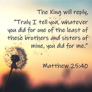 當人子在他榮耀裏降臨。萬民都要聚集在他面前。他要把他們分別出來,好像牧羊的分別綿羊山羊,把綿羊安置在右邊,山羊在左邊。王要向那右邊的說:蒙我父賜福的,請來承受為你們預備的國;因為我餓了,你們給我吃,渴了,你們給我喝;我作客旅,你們留我住;我赤身露體,你們給我穿;我病了,你們看顧我;我在監裏,你們來看我。義人就回答說:主啊,我們甚麼時候見你餓了,給你吃,渴了,給你喝?王要回答說:我實在告訴你們,這些事你們既做在我這弟兄中一個最小的身上,就是做在我身上了。