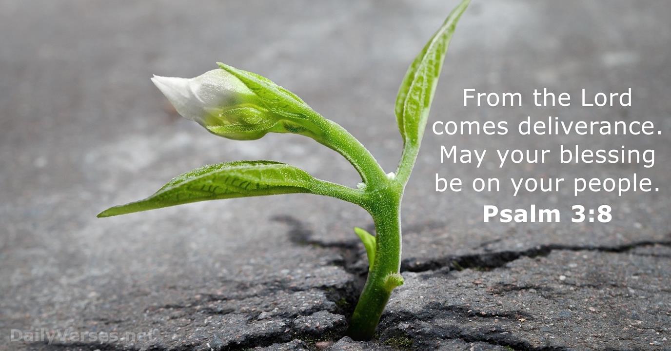 耶和華啊,有許多人議論我說:他得不著神的幫助。但你耶和華是我四圍的盾牌,是叫我抬起頭來的。我用我的聲音求告耶和華,他就從他的聖山上應允我。我躺下睡覺,我醒著,耶和華都保佑我。雖有成萬的百姓來周圍攻擊我,我也不怕。耶和華啊,求你起來!我的神啊,求你救我!因為你打了我一切仇敵的腮骨,敲碎了惡人的牙齒。救恩屬乎耶和華;願你賜福給你的百姓。